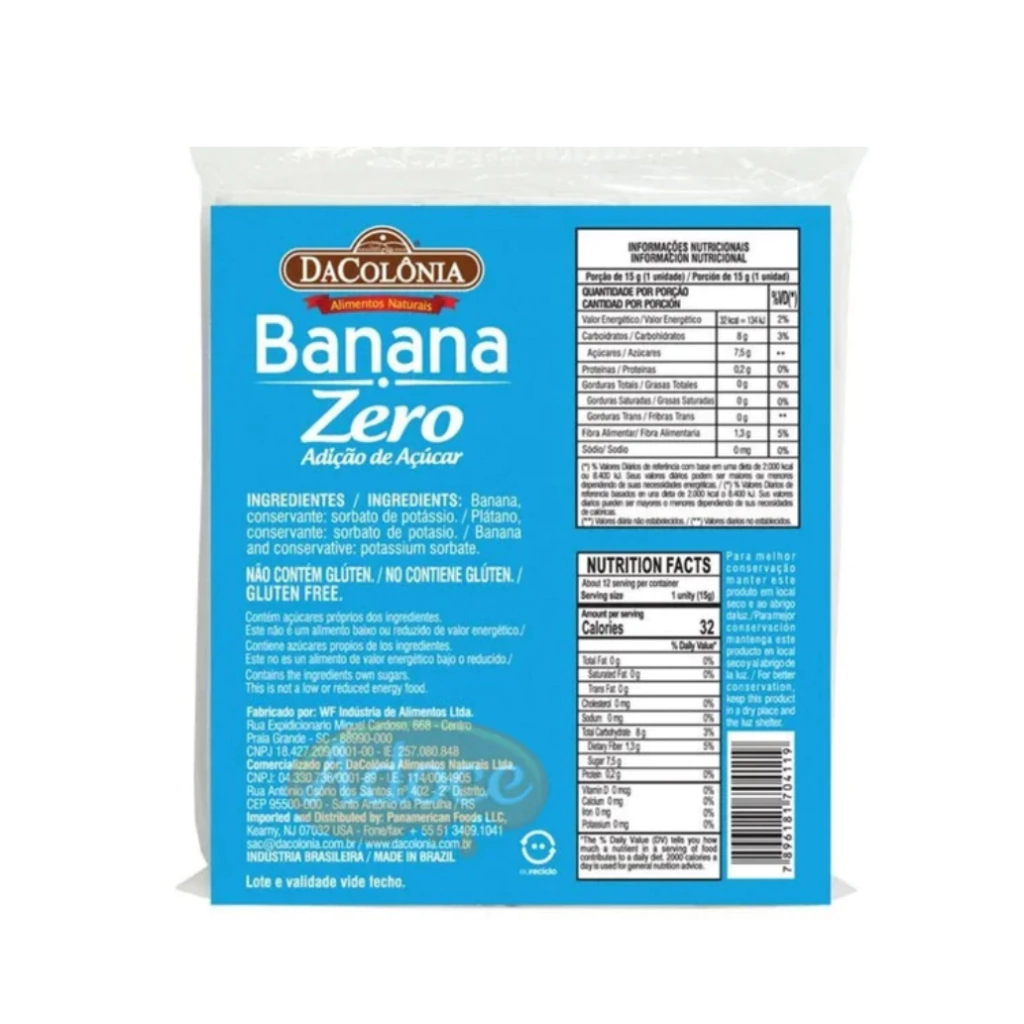 A Banana Zero DaColônia é zero açúcares, sem aditivos, sem adoçantes, sem lácteos e sem glúten! Um produto vegano. Uma ótima opção de docinho, você pode usar como sobremesa, pré-treino ou quando bater aquela vontade de um docinho!